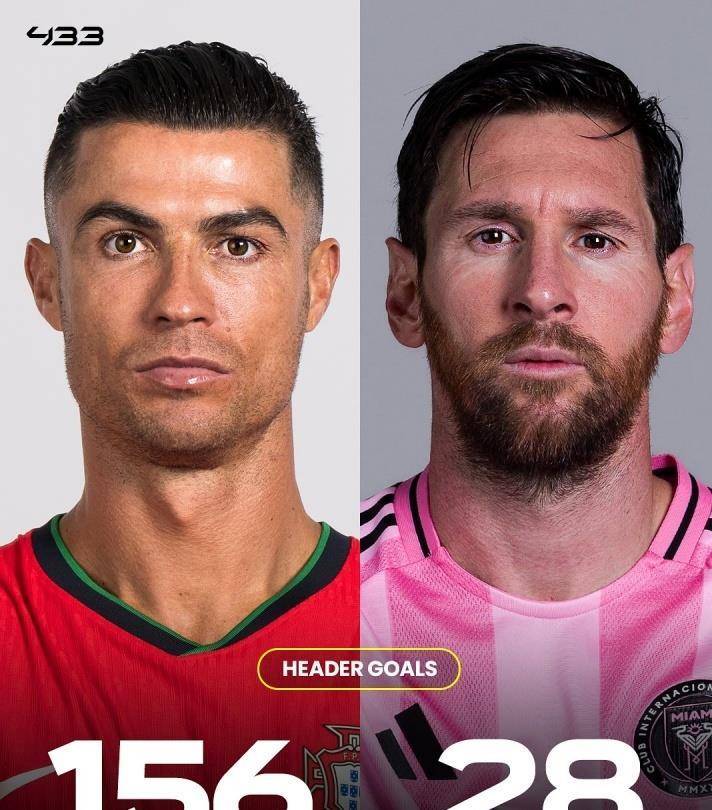 还有头球,C罗156个,梅西只有28个。 点球方面C罗进了178个,梅西111个。